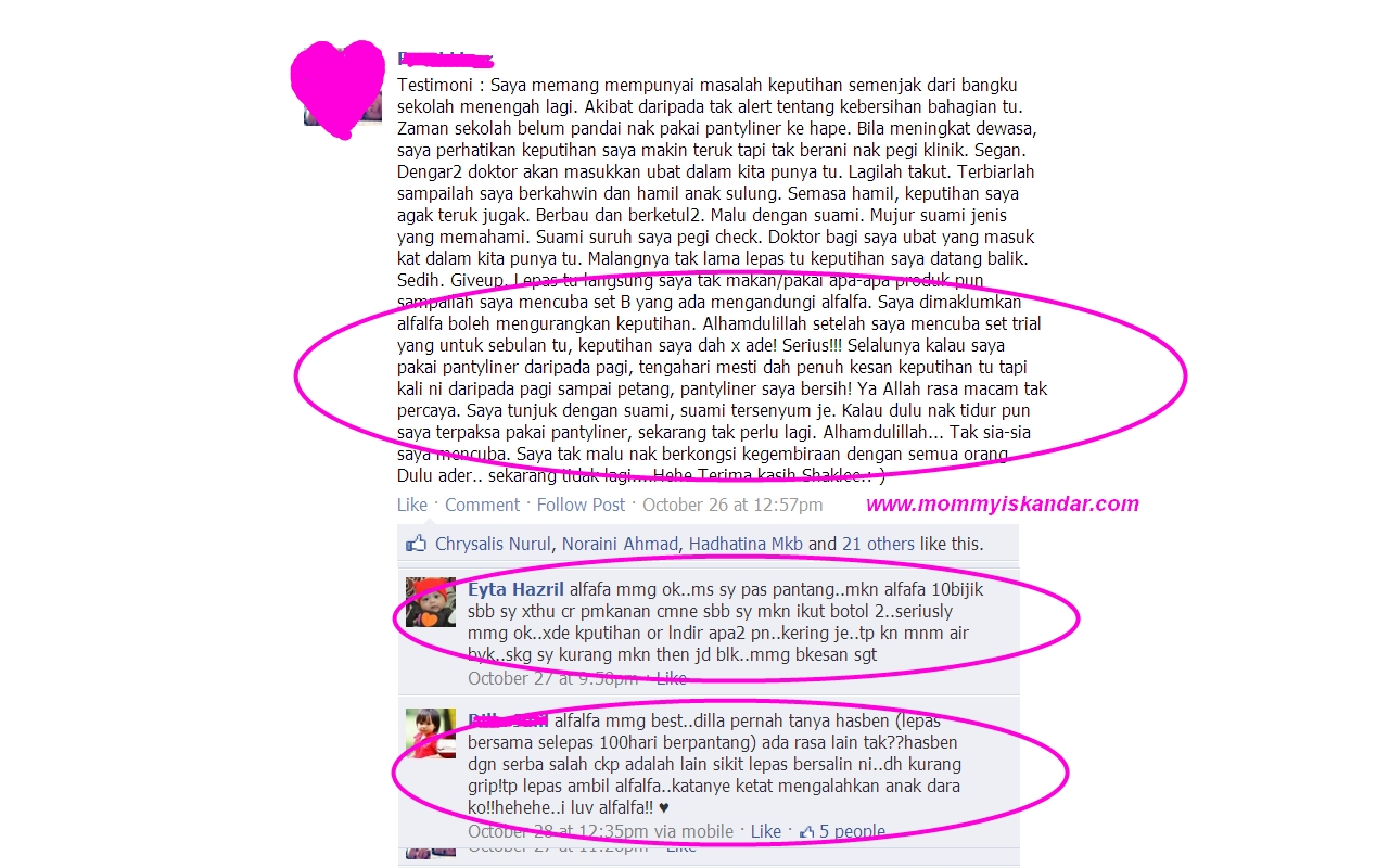 Kepada yang berminat mencuba Alfalfa, boleh dapatkan dari saya. Alfalfa ni memang sangat bagus untuk mengatasi keputihan, kencing tak lawas, sembelit dan pelbagai masalah wanita lain..Dan istimewanya, ia juga memberi kesan yang sangat baik terhadap hubungan suami isteri.. Harga Alfalfa? Cuma rm 53 untuk 330 tablet dan rm 97 untuk 700 tablet.