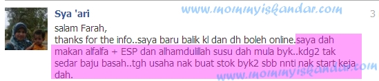 Alhamdulillah, kedua produk ini ESP + Alfalfa memang terbukti berkesan. Dan semestinya gabungan keduanya memberikan kesan yang Super Duper Hebat! Sekali lagi, suka saya ingatkan, amalkan mengambil air kosong 3L setiap hari dan usahakan pam setiap 3 jam, insyaAllah hasilnya memang meriah..