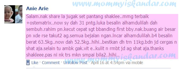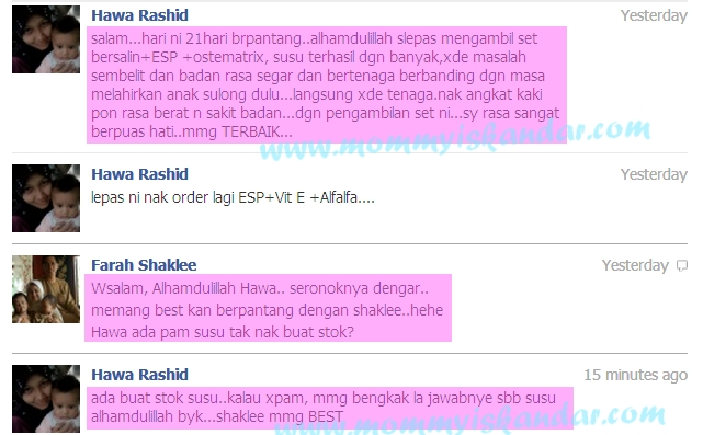 Alhamdulillah.. saya seronok sangat bila customer datang pada saya nak bagitau feedback yang baik. Mudah-mudahan lebih ramai ibu-ibu di luar sana yang dapat rasa manfaat Set Bersalin Shaklee ni.