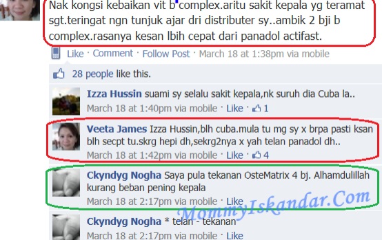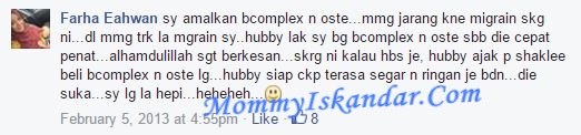 Alhamdulillah, kesan yang sangat menggembirakan. Kalau budget anda terhad, boleh mulakan dengan mengambil 2 suplemen dulu iaitu B Complex dan Ostematrix, tetapi jika budget tu ada…