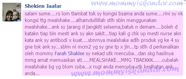 Saya sendiri mengamalkan Mealshake untuk anak-anak saya, dan alhamdulillah 3 Iskandar saya membesar dengan lebih sihat dan jarang sangat demam sekarang walaupun terkena hujan, atau pun terdedah dengan rakan-rakan yang tidak sihat. Saya lampirkkan testimoni customer untuk anda saksikan sendiri ya..