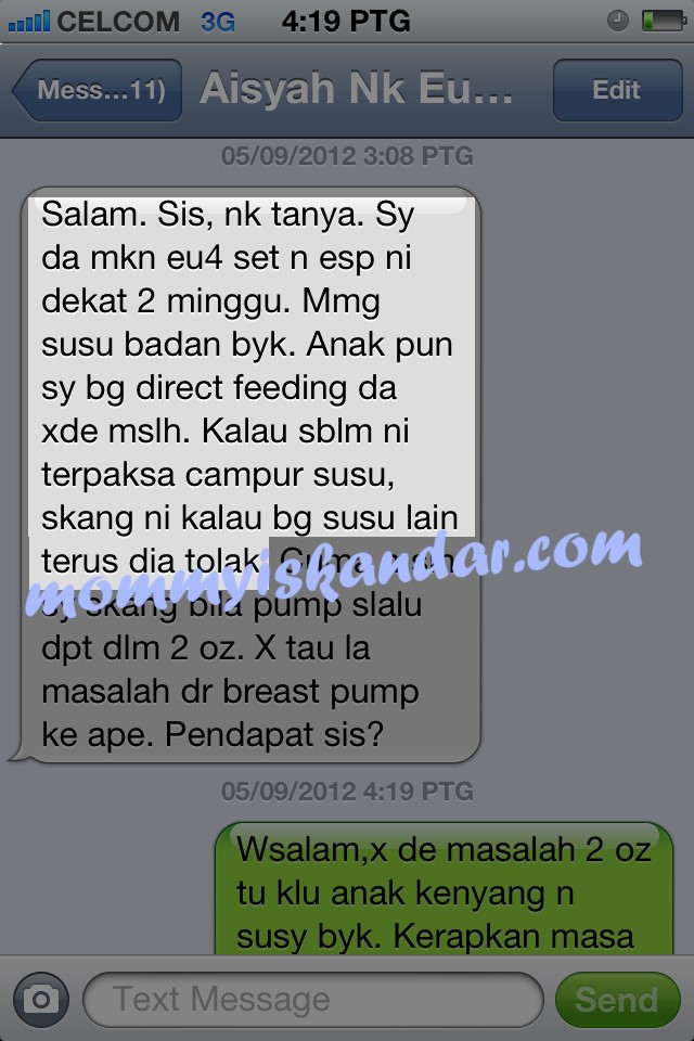 Dan antara perkara penting yang ibu harus tahu, ibu harus menyusukan bayinya secara terus pada payudara. Jangan sesekali memberikan bayi susu formula, mahupun menyusu dalam botol. Bila anda dah berikan susu melalui botol, bimbang bayi keliru puting dan langsung enggan menyusu direct pada payudara. Ini akan mengganggu pengeluaran susu secara normal, dan bimbang anda juga tak dapat bertahan jika asyik nak pam je sepanjang masa..